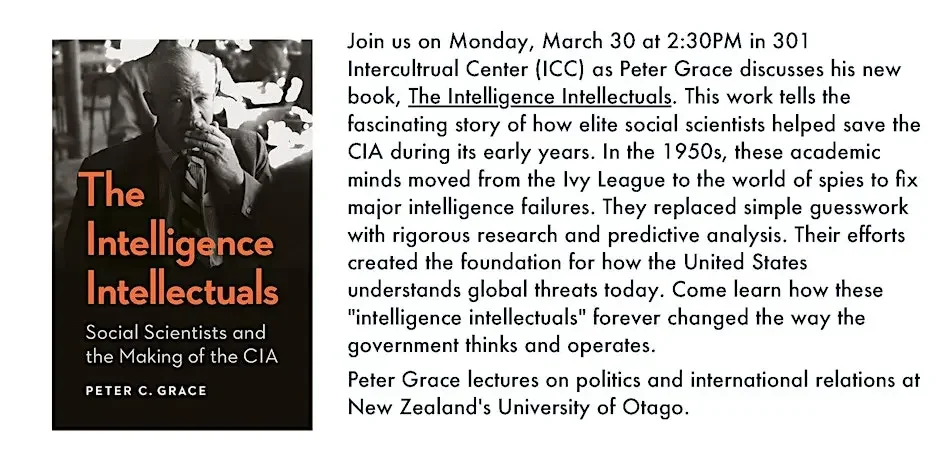 Join us in person for an engaging dive into how social scientists helped shape the CIA. Peter Grace, from the University of Otago, offers a fascinating insight into the minds of the early founders of the Central Intelligence Agency.